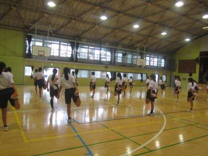 1年体育 久しぶりに体を動かす人もしっかり体をほぐして楽しく運動。