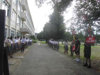 本日は由井第一小学校の前で青少対・PTAの方と児童会の皆さんと、そして本校の校門前ではビートレインズの方と一緒にあいさつ運動を行いました。さわやかな朝がスタートしました。
