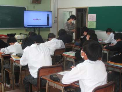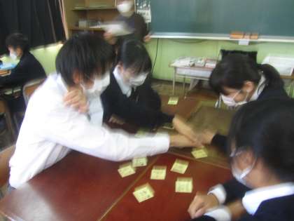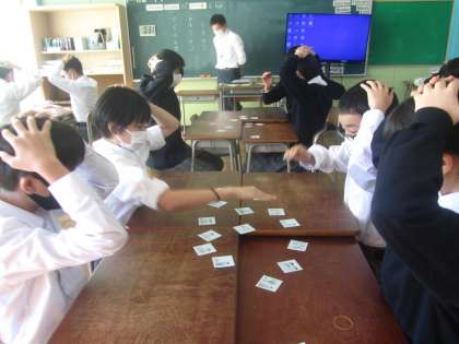 1年英語 リスニング練習の後は、現在進行形を使ったカルタ取りで楽しそうに学習していました。