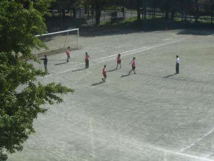 5組 校庭全面を使ってサッカー、全員よい動きをしています。