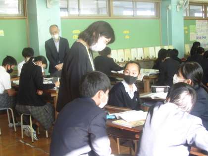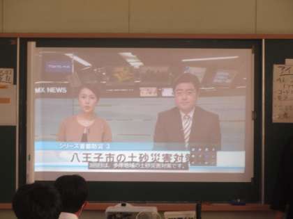 2年家庭科 昨日も地震。数年前の八王子の土砂災害の映像も参考に、自分で出来ることについて班で学び合い。飛び入り参加の先生も加わってよく考えていました。