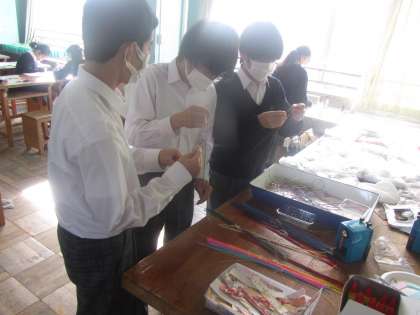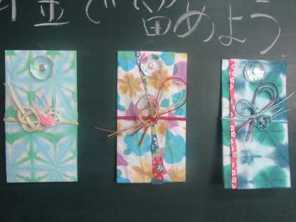 2年美術 「祝儀袋」づくり。お祝いの気持ちをたっぷり込めて水引細工をしました。明るく楽しい色調の作品に生徒の皆さんの個性が表れていました。