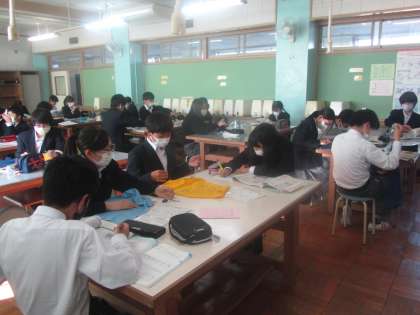 1年家庭科 ブックカバーづくり。モノづくりが得意な生徒の皆さん。