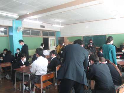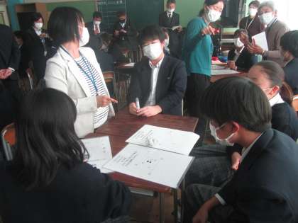 意欲的な生徒の皆さんの学び合いに加え、特に、今日初めて会った他の学校の先生にも質問があれば自分で呼んで尋ねることができる「いつでも、どこでも、誰とでも」上手に関わることができる力を市の指導主事や他校の先生にご覧いただくことができました。