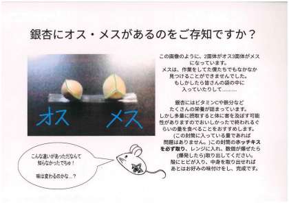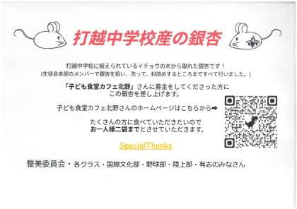 一方、拾ったぎんなんがどうなったのか見たことがないとの声もあるので、本校2階の廊下中央部に、ビニールに入れ中身が見えるものを設置しました。大人は募金できます。
