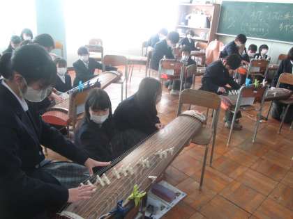 1年音楽 琴。上手に弾けたときは皆で拍手!