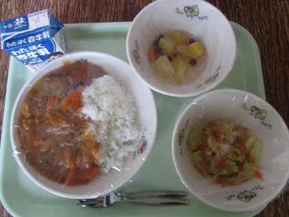 ハヤシライス、和風サラダ、タピオカポンチ、牛乳。
