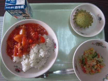 チキンのトマト煮込み、ガーリックライス、フレンチサラダ、桑都カップケーキ(桑の葉粉使用)、牛乳。