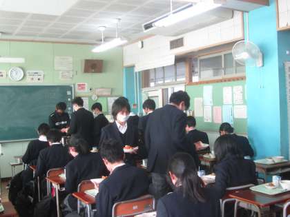 今学期最後の給食です。おかわりの列もできていました。