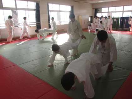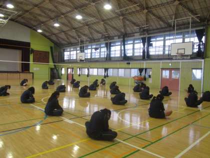 2年体育 念入りに準備体操で体をほぐしている生徒の皆さん。