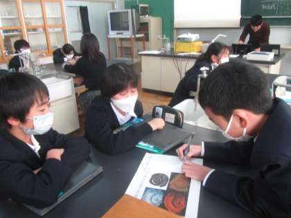 1年理科 アンモナイトの化石を班で考察、楽しそうに学び合い。