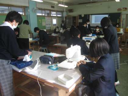 1年家庭科 ミシンとアイロンがけ、丁寧に仕上げていました。