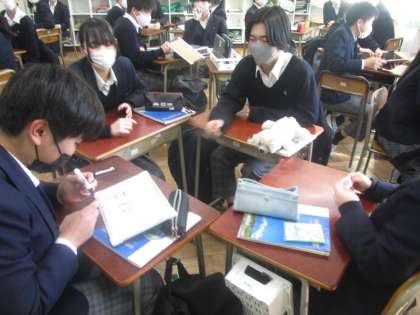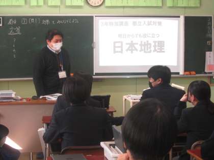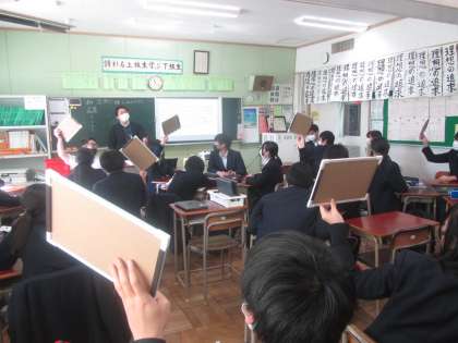 3年社会 ヒントを聞いて班で答える県名クイズで大盛り上がり。入試で出そうなポイントも盛りだくさん。充実の1時間でした。