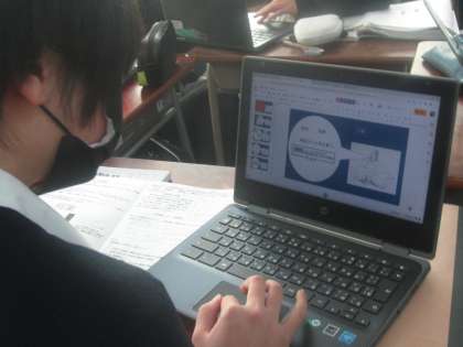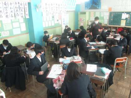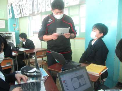 「学び合い×ICt」の授業づくりを毎日進化させています。クイズで楽しく盛り上がった後は、タブレットでスライド提出、テンポ良い授業で、授業終わりには生徒から「社会の授業はあっという間だ〜。」という声が聞こえてきました。生徒の皆さんも全力で頑張りました。