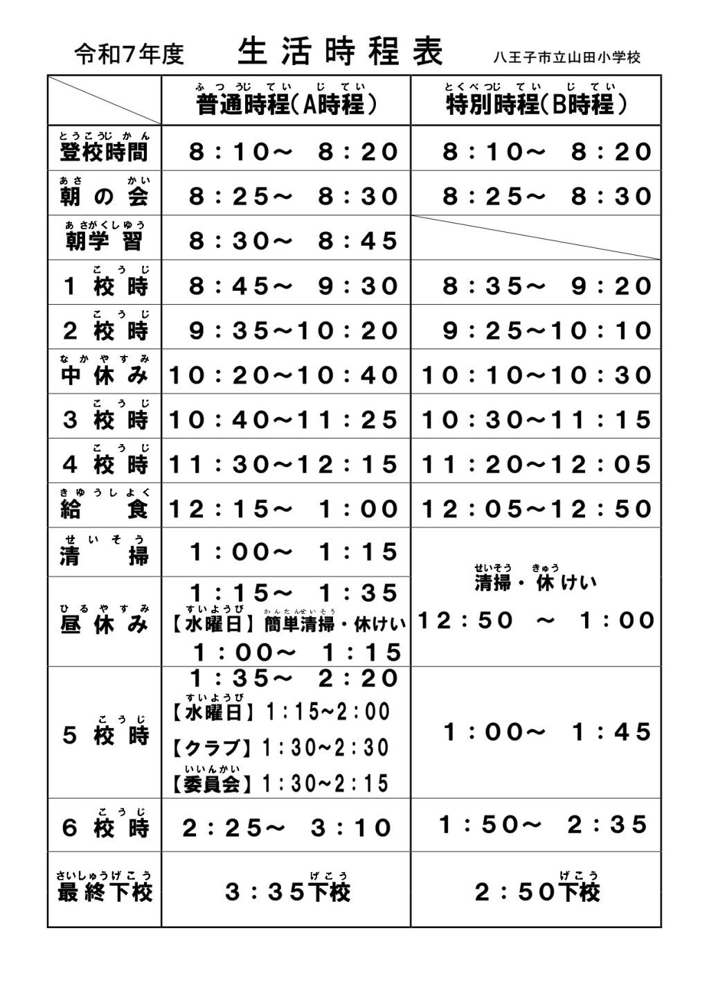 | 朝の会 | 8:25 | 〜 | 8:30 | 8:25 | ~ | 8:30 | |