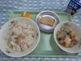今日の献立:たけのこごはん・いかの松かさ焼き・塩肉じゃが・果物(清美オレンジ)・牛乳