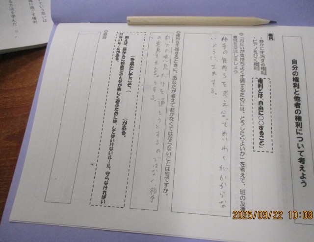 お互いが気持ちよく生活するためにはどうしたらよいか考えることを通して、自分の権利を主張するには相手の権利も大切にしなくてはならないことを学びました。