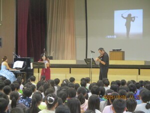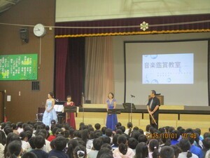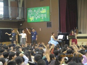 ピアノ、ヴァイオリン、歌唱(ソプラノ)の4人のプロの音楽家が来校して素敵な音楽を聴かせてくれました。