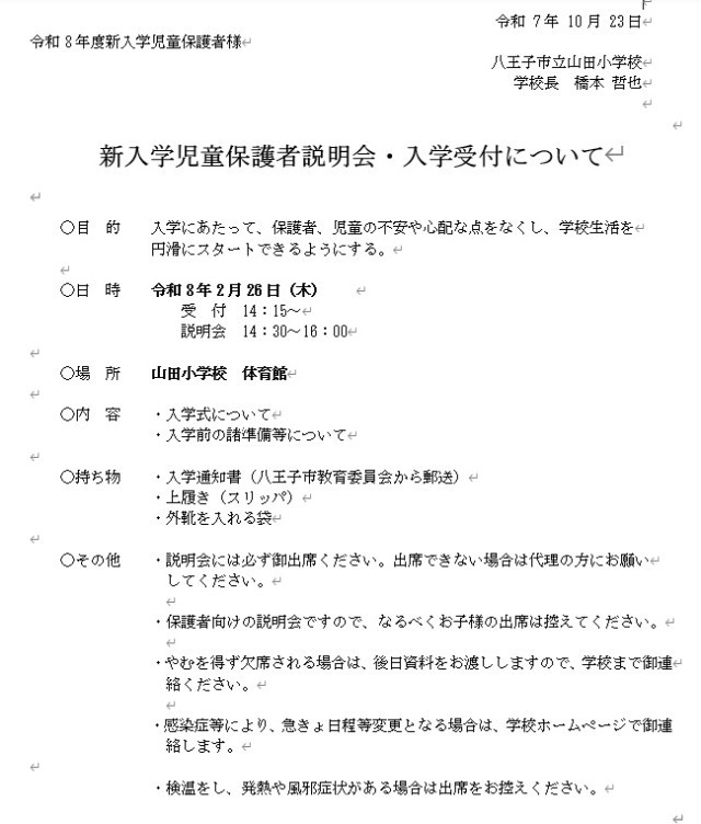 ☆新入生保護者入学説明会は、令和8年2月26日(木)14:15受付です。持ち物などは、就学時健康診断時に配布のお便り「新入学児童保護者説明会・入学受付について(写真3参照)」にあります通り、「入学通知書」「上履き」「外履き入れ」です。