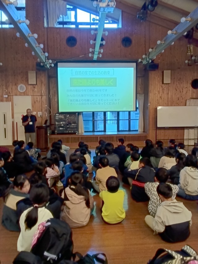 開所式の後は、宿の方から宿での過ごし方についてオリエンテーションがありました。ここの施設は46年経っているそうですが、それは使った人たちがきちんと綺麗に使ってくれているからとのお話がありました。