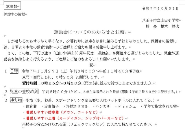 ★先日紙面配布のお知らせ【写真2】でもお知らせいたしましたが、子どもたちが他学年の応援、鑑賞をする際の防寒対策として、着脱しやすい上着、防寒着を当日着用させていただきますようお願いいたします。また、足腰の冷え対策として、厚手のひざ掛けなども持たせていただけると助かります。