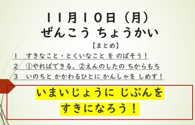 11月10日(月)好き・得意で輝く(全校朝会校長講話、自己効力感・肯定感、運動会、もったいない大作戦)