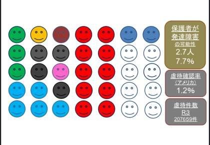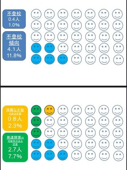 黄…特異な才能(2.3%・0.8人) 緑…発達障がいのある可能性(7.7%・2.7人)