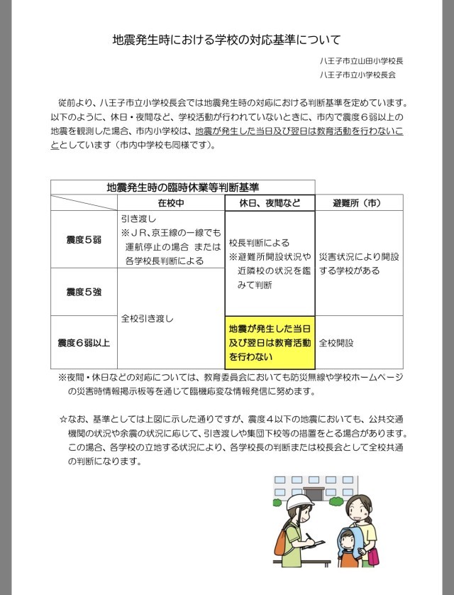 八王子市立小中学校では、地震発生時におけるがっこうの対応基準を設けています。児童在校中、八王子市に震度5強以上の地震がありましたら、自動的に学校引き渡しとなります。その他基準も含め、改めてご確認ください。