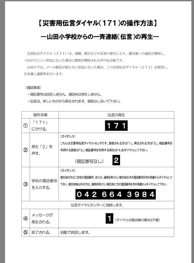 災害時には、HP、H&Sは利用できないことが予想されます。学校からの情報は、災害伝言ダイヤルでも発信いたします。こちらの利用方法も合わせてご確認ください。