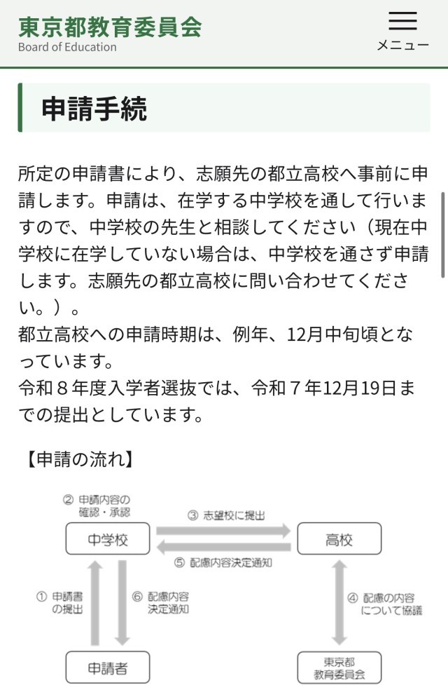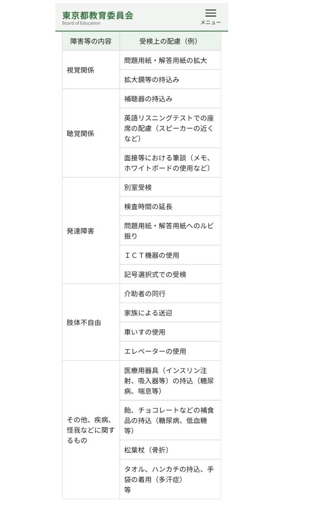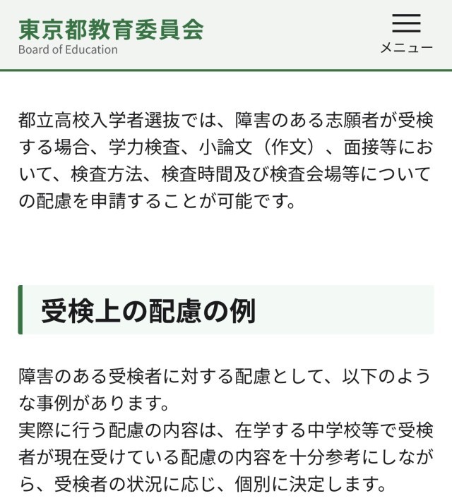 「視力の困り感からめがねをかけること」「聴力の困り感から補聴器をつけること」「発達の困り感からICT機器を活用すること」「困り感の解消のためにうぐいす教室を利用すること」…これらはすべて、個々に認められた「合理的配慮」であり、小中学校での一定の実績があれば、都立高校の受検でも配慮を受けることができます。小学校での配慮内容の参考としてください。【下部リンク参照】