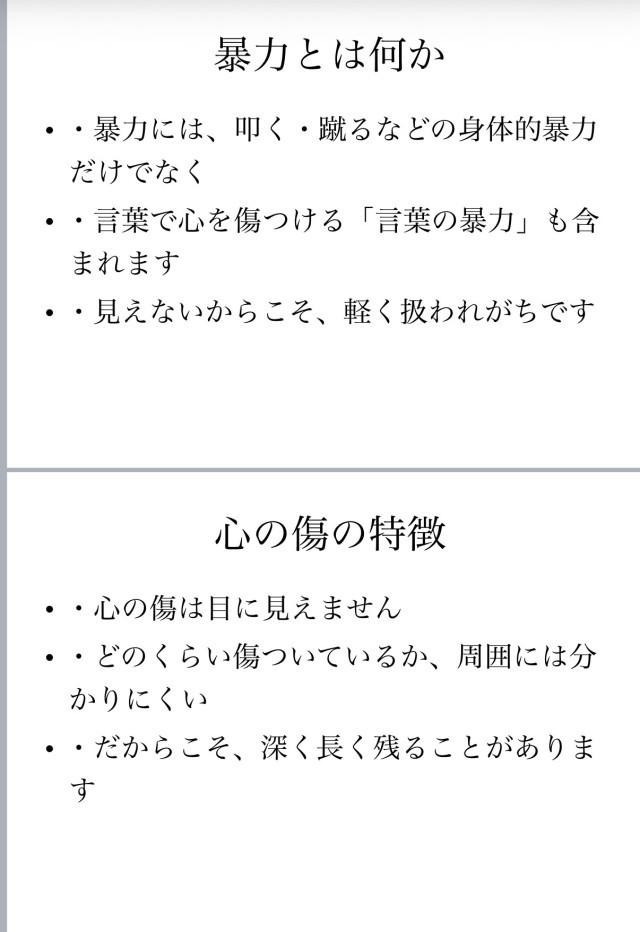 心の傷は、擦り傷のように治癒が目に見えるもこではありません。だからこそ、心を傷つけることも暴力だということを一人一人がしっかりと認識しなければなりません。