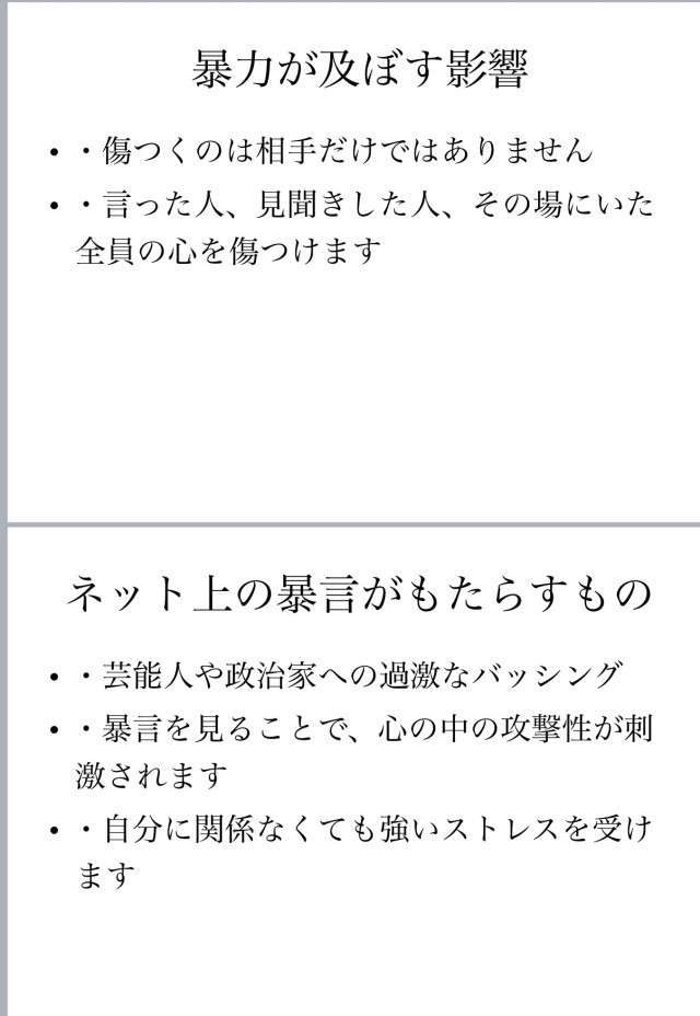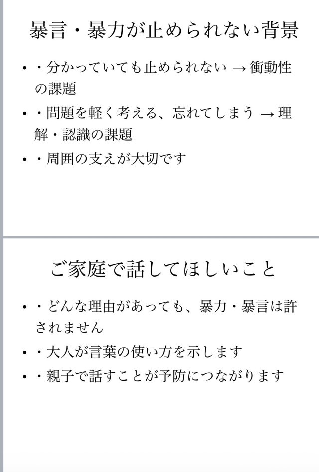 ご家庭でも、「いかなる理由があっても、暴力・暴言が許されない」ということ、また、「そこにいる人たちみんなを傷つけている」ということについて、親子で話題にしてください。