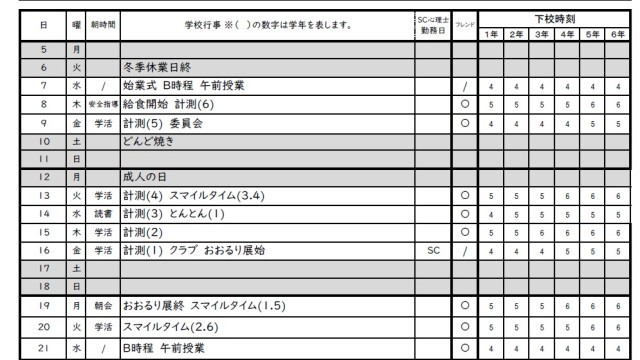 ★今回の変更により、子どもが学校で何時間授業を受けているのかは一目で分かりづらくなりますが、授業時数が通常と異なる場合は、行事予定の記載の欄に「4時間授業」などと記載がされています。デメリットを差し引いてあまりあるメリットがあると確信しています。授業時数については、必要でしたら曜日ごとに暗記するか、下校時刻から類推するかしていただきますようお願いいたします。