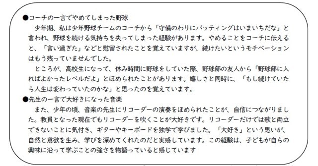 本日配付いたします「学校だより」では、とある日の6年生との校長室会食で話題となった、校長自身の子ども時代の経験をもとに、子どもの意欲に大人の何気ない一言が大きく関わることがあることについてお伝えしています。