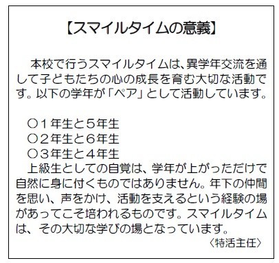 今号では、特別活動主任のSue教諭が「スマイルタイム」の意義を寄稿しています【写真2】。