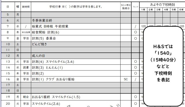 また、先日紹介した通り、学校だより担当のSuz教諭とSa教諭が、12月に何時間もかけて変更してくれた下校時刻表記バージョンの行事予定配信もスタートです【写真3】。