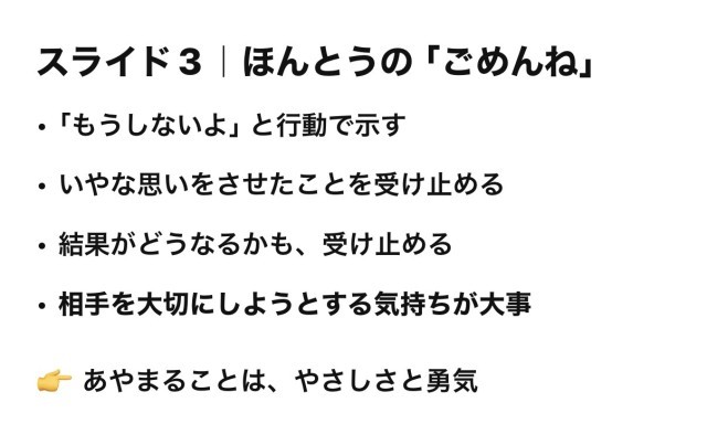 そして、謝ること、または改善の意志を自分の変容で示すことを決めた子どもの勇気や、相手を思う優しさを価値づけ、応援ができる大人にならなければならないと思います。