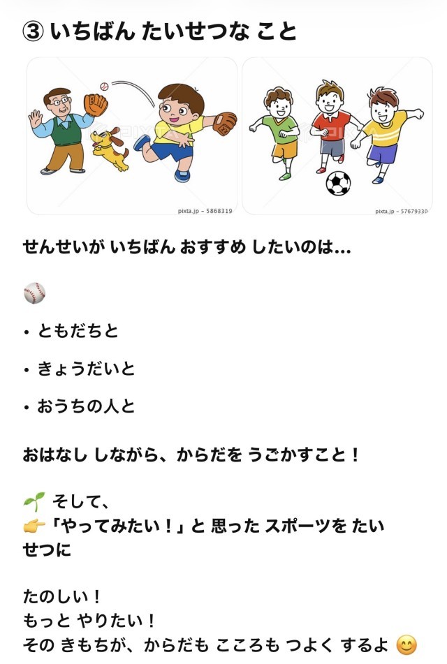 …と、理屈上はこれまで述べた通りだと思っていますが、私が小学校期になによりおすすめなのは、「友達、きょうだい、親子などで対話をしながらキャッチボールなどで体を動かすこと」や「子どもがやりたいと思ったスポーツ」です。人間性を向上させることや夢中になれること見つけにつながるのではないかと思います。