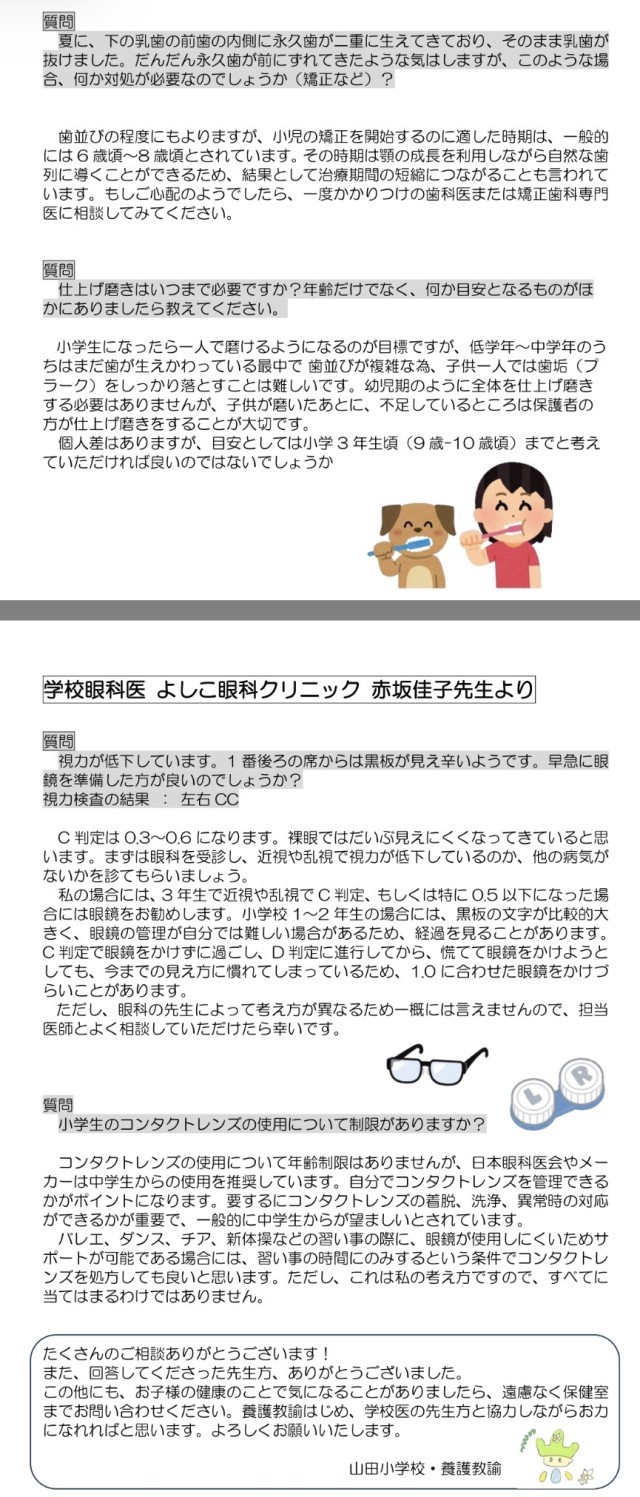 本来であれば、医師の先生方のお話は、関心のある保護者の方が学校に参集しなければ直接聞くことができない内容です。今回は、保護者の皆様への事前アンケートをもとに医師へ回答を依頼し、教職員と学校医による委員会で協議した内容を、保健だよりを通して広くお届けする形を取りました。これにより、多くの保護者の方に専門的な知見を共有することができました。養護教諭の的確なコーディネートと工夫が生きた取組となりました。