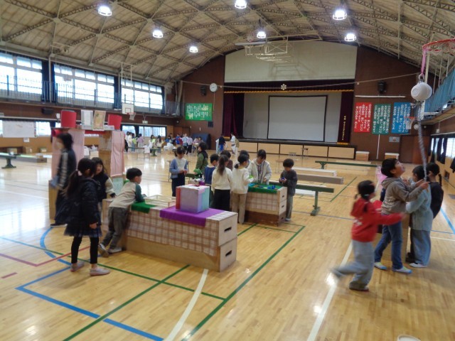 今日は、1.2年生が近隣保育園、幼稚園、認定子ども園の子を体育館に招待して、冬まつりを開催しています。