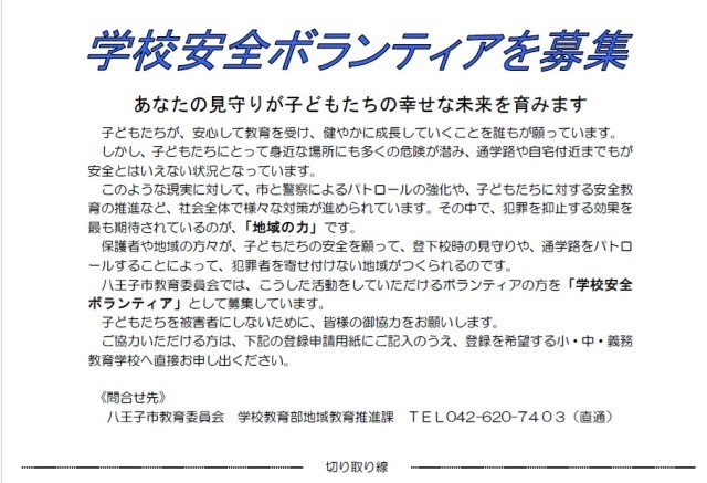 同時に、地域の見守りボランティアわを募集します。山田小学校を多くの方で見守っていただくことが、子どもたちの交通安全意識を高めるとともに、生活安全面でも犯罪抑止につながります。