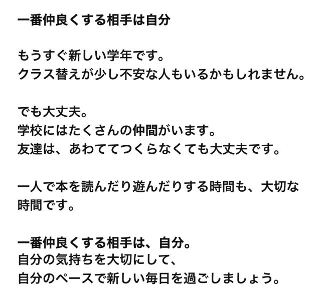 職場や地域のコミュニティを想起しながら、クラス内という小さなコミュニティの中で友達ができなくてもほとんど困らないこと、また、小中学校では、仲間と良い距離感をつくる練習をすることが大切なことを話題にしてもらえたら嬉しいです。