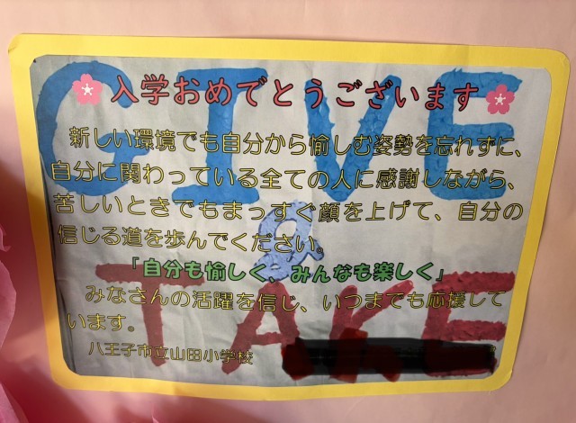 入学式には、山田小PTA、そして、山田小卒業時の担任より祝電が届いていました。U先生も、山形からみなさんのことを応援しています。