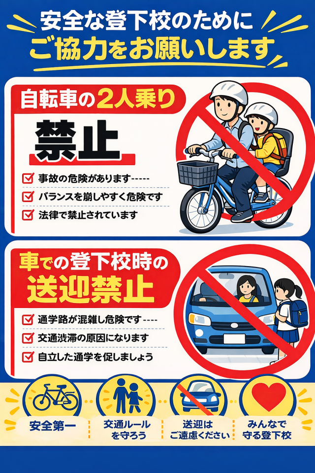 自転車、バイク、車などでの送りはおやめいただき、徒歩または公共交通機関(区域外通学の場合必要に応じて)にて登下校できるよう、ご家庭にてご指導ください。