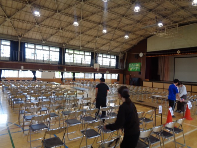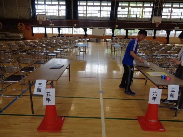 体育館入り左側が奇数学年、右側が偶数学年で椅子をご用意しています。
