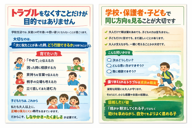 子どもが学校生活を送る中では、友達との行き違い、言葉のすれ違い、仲間外れに感じる出来事、思うようにいかない悔しさなど、さまざまなトラブルに出会います。わが子がつらい思いをしたと聞けば、保護者の方が胸を痛め、「すぐに解決してあげたい」と思うのは自然なことです。学校もまた、安心して学べる環境を整える責任があります。だからこそ、起きた出来事への対応は丁寧に行っていきます。
