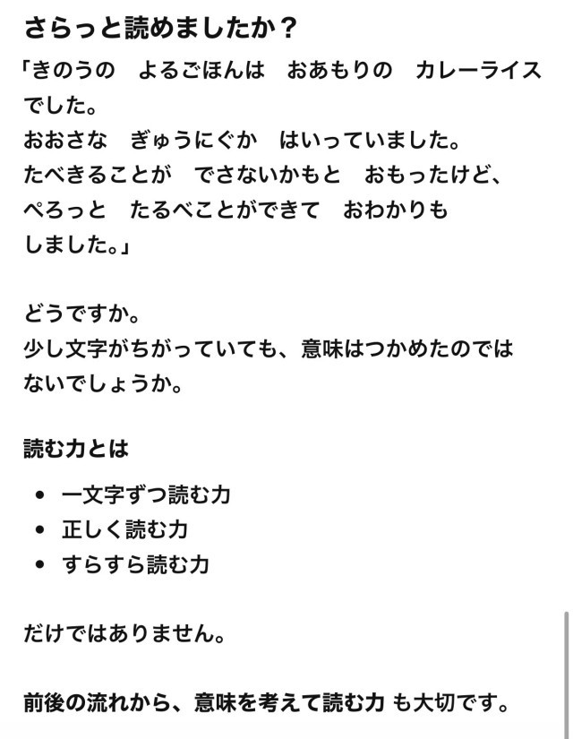 これは、子どもの「読む力」を考えるうえでも大切な視点です。読む力というと、すらすら読めること、漢字を正しく読めること、音読でつかえないことに目が向きがちです。もちろん、それらは学習の土台として大切です。しかし、それだけが読みの力ではありません。書かれている内容を理解し、文と文のつながりを考えながら読むことも、同じように大切です。