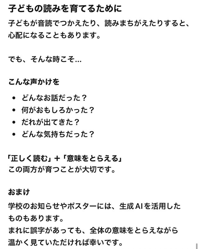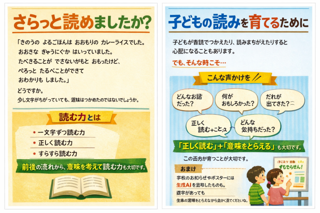 学校からのお知らせやポスターの一部には、生成AIを活用して作成したものもあります。便利な道具ですが、なかなかの頻度で誤字や不自然な表現が含まれることがあります。その際は、一文字だけにとらわれず、全体の意味をとらえながら温かく読んでいただければ幸いです。