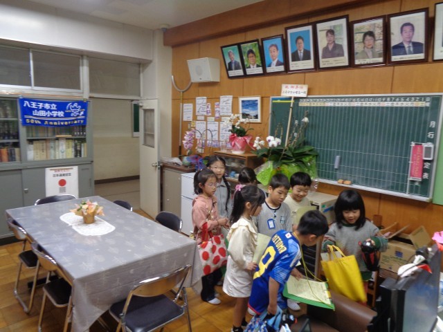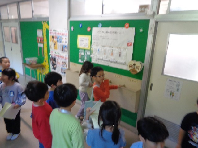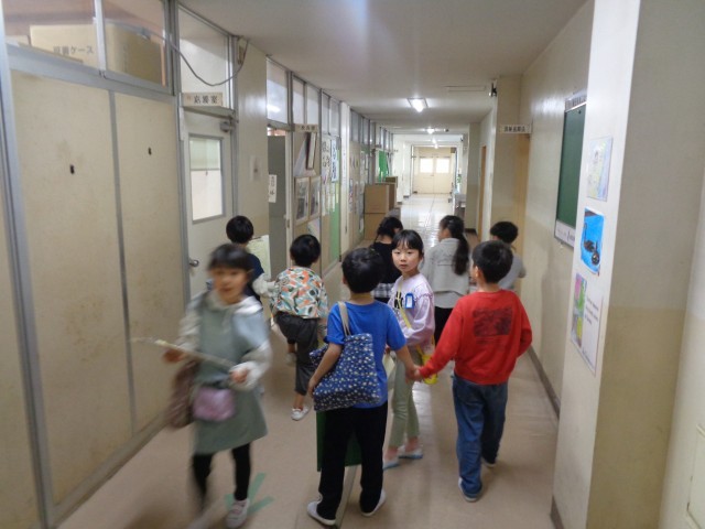 4時間目、2-2と1-2でペアグループをつくり、学校探検をしています。