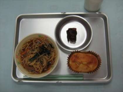 (しょうゆラーメンは、1年3組さんがリクエストしてくれました。豚の角煮をラーメンにのせて食べるとおいしいです。豆っこケーキは、白いんげん豆が入っています。)